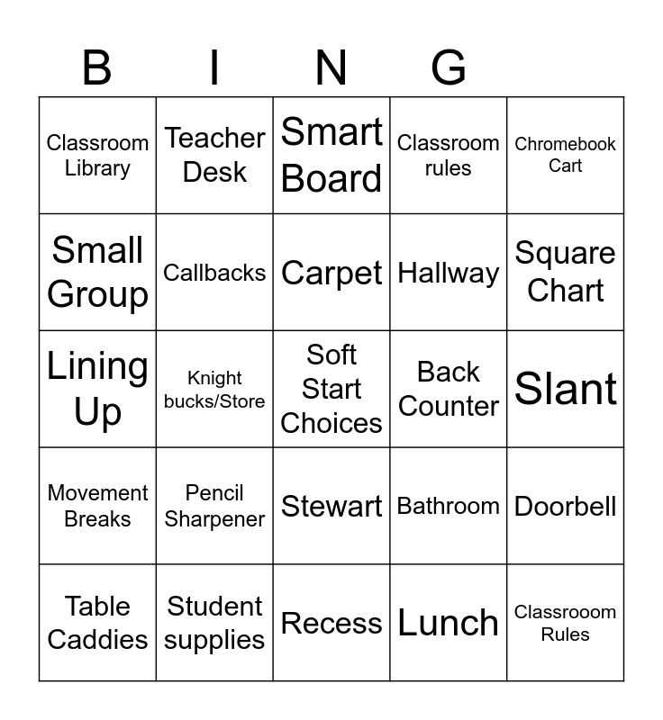 This bingo card has 25 words: Pencil Sharpener, Recess, Carpet, Table Caddies, Chromebook Cart, Classroom Library, Small Group, Teacher Desk, Back Counter, Stewart, Hallway, Lining Up, Bathroom, Doorbell, Callbacks, Classrooom Rules, Slant, Smart Board, Square Chart, Knight bucks/Store, Soft Start Choices, Student supplies, Movement Breaks, Classroom rules and Lunch.