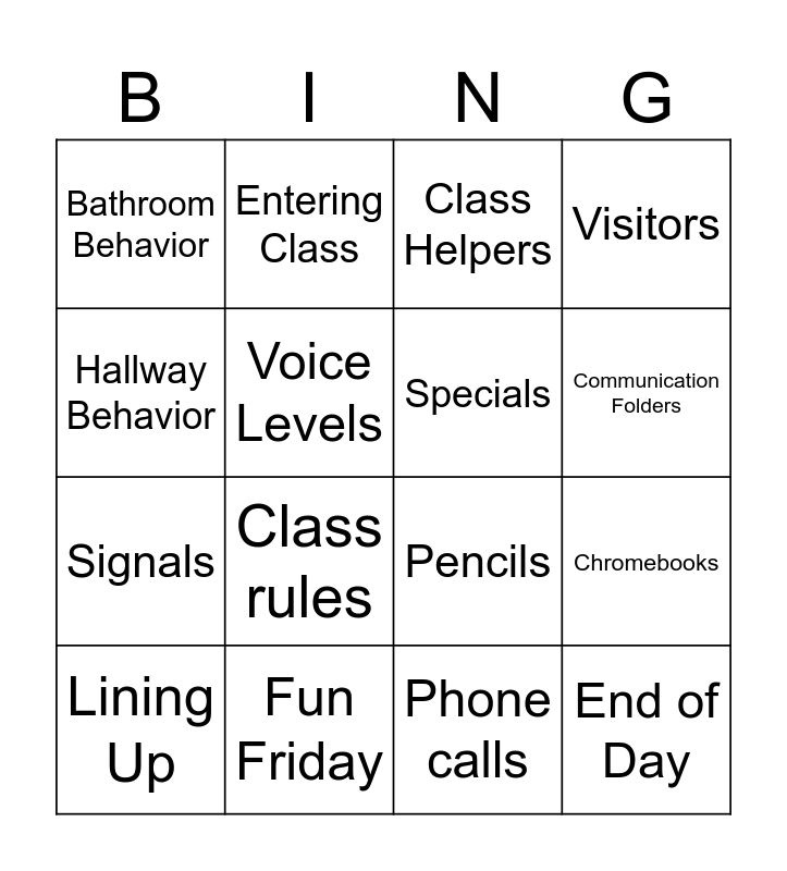 This bingo card has 20 words: Chromebooks, Rewards, Class Helpers, Directions, Lining Up, Hallway Behavior, Fun Friday, Bathroom Behavior, Signals, Entering Class, Class rules, Pencils, Voice Levels, End of Day, Specials, Lunchroom Behavior, Communication Folders, Visitors, Phone calls and Recess.