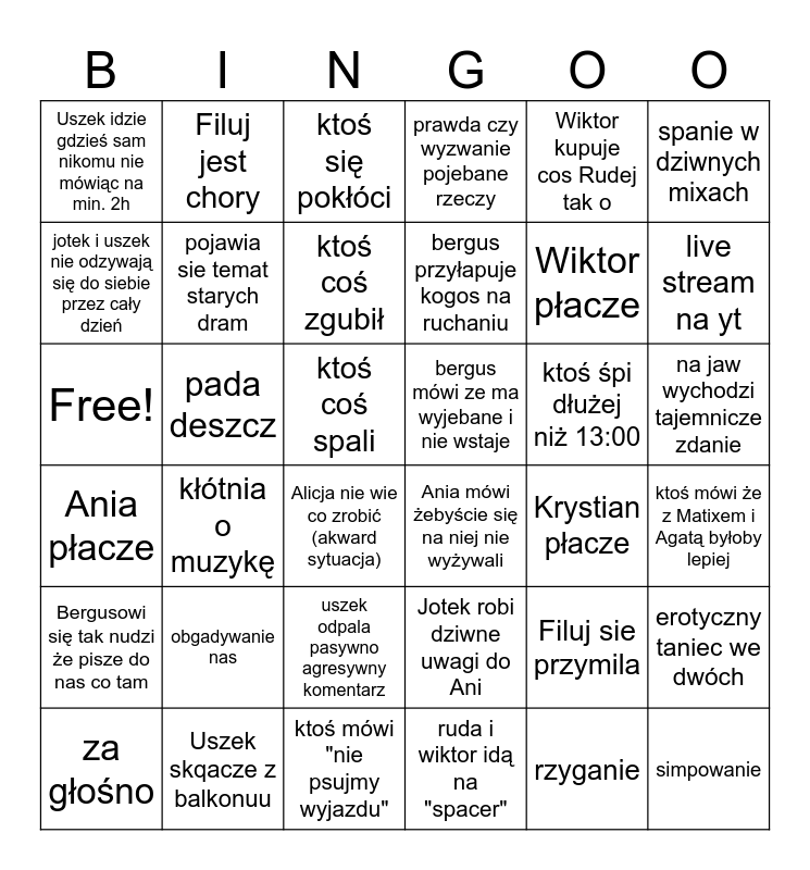 This bingo card has 36 words: Jotek robi dziwne uwagi do Ani, uszek odpala pasywno agresywny komentarz, ruda i wiktor idą na "spacer", jotek i uszek nie odzywają się do siebie przez cały dzień, Ania płacze, bergus mówi ze ma wyjebane i nie wstaje, pojawia sie temat starych dram, ktoś mówi "nie psujmy wyjazdu", Wiktor kupuje cos Rudej tak o, Filuj sie przymila, live stream na yt, prawda czy wyzwanie pojebane rzeczy, erotyczny taniec we dwóch, pada deszcz, bergus przyłapuje kogos na ruchaniu, Uszek idzie gdzieś sam nikomu nie mówiąc na min. 2h, Bergusowi się tak nudzi że pisze do nas co tam, ktoś śpi dłużej niż 13:00, Free!, ktoś się pokłóci, ktoś coś spali, kłótnia o muzykę, Ania mówi żebyście się na niej nie wyżywali, Alicja nie wie co zrobić (akward sytuacja), Krystian płacze, Filuj jest chory, Wiktor płacze, Uszek skqacze z balkonuu, ktoś coś zgubił, spanie w dziwnych mixach, simpowanie, za głośno, ktoś mówi że z Matixem i Agatą byłoby lepiej, na jaw wychodzi tajemnicze zdanie, obgadywanie nas and rzyganie.