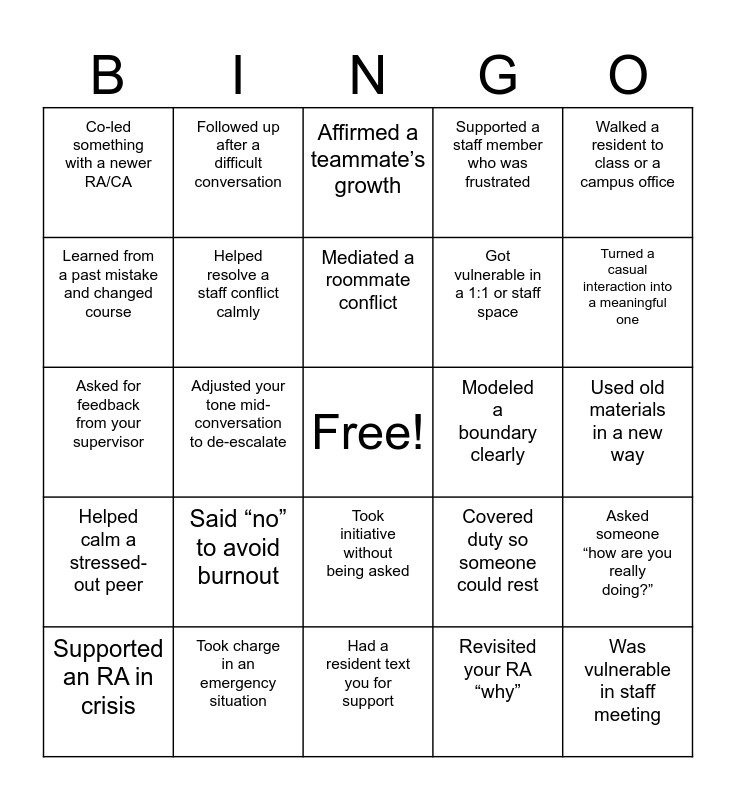 This bingo card has a free space and 29 words: Supported an RA in crisis, Advocated for something at a hall or ResLife level, Adjusted your tone mid-conversation to de-escalate, Volunteered to lead a meeting or agenda item, Co-led something with a newer RA/CA, Affirmed a teammate’s growth, Helped resolve a staff conflict calmly, Said “no” to avoid burnout, Modeled a boundary clearly, Took charge in an emergency situation, Used old materials in a new way, Was vulnerable in staff meeting, Had a resident text you for support, Revisited your RA “why”, Turned a casual interaction into a meaningful one, Started a new tradition on your floor or staff, Took initiative without being asked, Helped calm a stressed-out peer, Walked a resident to class or a campus office, Asked for feedback from your supervisor, Covered duty so someone could rest, Let go of a habit that burned you out, Got vulnerable in a 1:1 or staff space, Learned from a past mistake and changed course, Supported a staff member who was frustrated, Followed up after a difficult conversation, Asked someone “how are you really doing?”, Mediated a roommate conflict and Planned a program that aligned with your values.