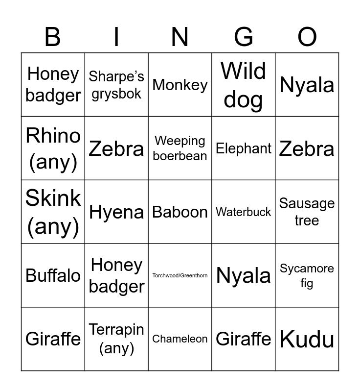 This bingo card has 89 words: Free!, Baobab, Torchwood/Greenthorn, Mopane, False-marula, Marula, Knob thorn, Buffalo-thorn, Matumi, Leadwood, Jackalberry, Magic guarri, Sycamore fig, Sausage tree, Apple-leaf, Weeping boerbean, Tamboti, Candelabra-tree, Rock fig, Snake (any), Monitor lizard (any), Crocodile, Chameleon, Plated lizard (any), Skink (any), Terrapin (any), Lion, Leopard, Cheetah, Jackal (any), Wild dog, Hyena, Genet (any), Honey badger, Baboon, Monkey, Rhino (any), Elephant, Zebra, Giraffe, Buffalo, Hippo, Warthog, Kudu, Nyala, Waterbuck, Bushbuck, Duiker, Steenbok, Sharpe’s grysbok, Klipspringer, Dassie, Scrub hare, Squirrel, Mongoose (any), Snake (any), Monitor lizard (any), Crocodile, Chameleon, Plated lizard (any), Skink (any), Terrapin (any), Lion, Leopard, Cheetah, Jackal (any), Wild dog, Hyena, Genet (any), Honey badger, Baboon, Monkey, Rhino (any), Elephant, Zebra, Giraffe, Buffalo, Hippo, Warthog, Kudu, Nyala, Waterbuck, Bushbuck, Duiker, Steenbok, Sharpe’s grysbok, Klipspringer, Squirrel and Mongoose (any).
