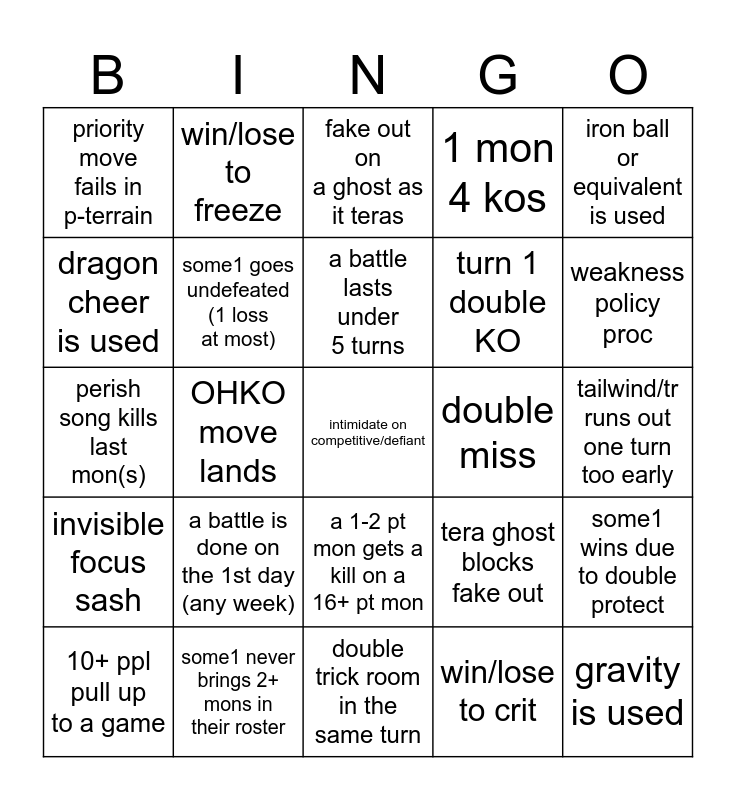 This bingo card has a free space and 24 words: a battle is done on the 1st day (any week), some1 never brings 2+ mons in their roster, a battle lasts under 5 turns, 10+ ppl pull up to a game, iron ball or equivalent is used, priority move fails in p-terrain, dragon cheer is used, win/lose to freeze, double miss, a 1-2 pt mon gets a kill on a 16+ pt mon, turn 1 double KO, perish song kills last mon(s), tera ghost blocks fake out, some1 wins due to double protect, some1 goes undefeated (1 loss at most), win/lose to crit, tailwind/tr runs out one turn too early, fake out on a ghost as it teras, weakness policy proc, OHKO move lands, gravity is used, invisible focus sash, 1 mon 4 kos and double trick room in the same turn.