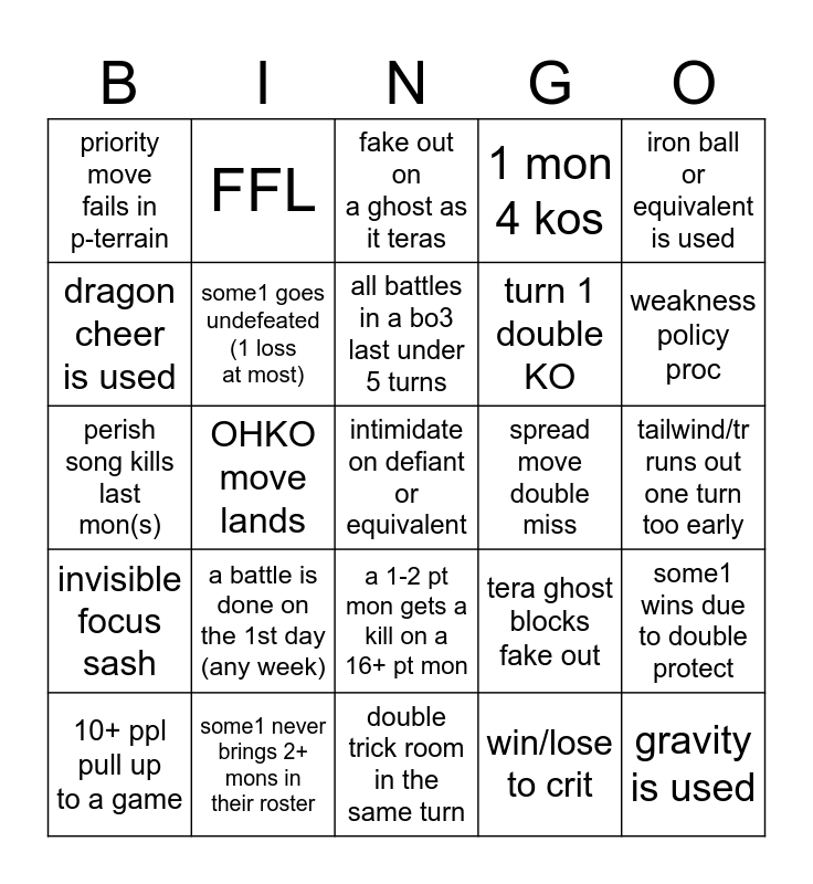 This bingo card has a free space and 24 words: a battle is done on the 1st day (any week), some1 never brings 2+ mons in their roster, all battles in a bo3 last under 5 turns, 10+ ppl pull up to a game, iron ball or equivalent is used, priority move fails in p-terrain, dragon cheer is used, FFL, spread move double miss, a 1-2 pt mon gets a kill on a 16+ pt mon, turn 1 double KO, perish song kills last mon(s), tera ghost blocks fake out, some1 wins due to double protect, some1 goes undefeated (1 loss at most), win/lose to crit, tailwind/tr runs out one turn too early, fake out on a ghost as it teras, weakness policy proc, OHKO move lands, gravity is used, invisible focus sash, 1 mon 4 kos and double trick room in the same turn.