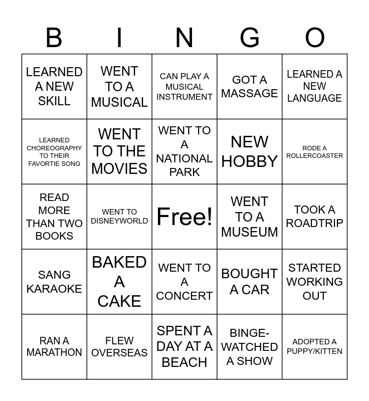 This bingo card has a free space and 24 words: BAKED A CAKE, FLEW OVERSEAS, WENT TO A NATIONAL PARK, RAN A MARATHON, LEARNED A NEW LANGUAGE, LEARNED A NEW SKILL, LEARNED CHOREOGRAPHY TO THEIR FAVORTIE SONG, WENT TO A MUSICAL, WENT TO A MUSEUM, WENT TO A CONCERT, NEW HOBBY, READ MORE THAN TWO BOOKS, BOUGHT A CAR, STARTED WORKING OUT, WENT TO THE MOVIES, BINGE-WATCHED A SHOW, TOOK A ROADTRIP, CAN PLAY A MUSICAL INSTRUMENT, RODE A ROLLERCOASTER, WENT TO DISNEYWORLD, ADOPTED A PUPPY/KITTEN, SANG KARAOKE, GOT A MASSAGE and SPENT A DAY AT A BEACH.