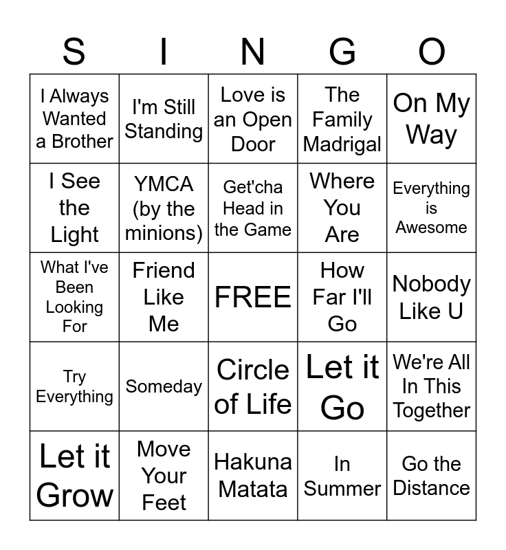 This bingo card has a free space and 27 words: Let it Go, You're Welcome, Where You Are, Hakuna Matata, I See the Light, Love is an Open Door, I'm Still Standing, Try Everything, How Far I'll Go, We're All In This Together, What I've Been Looking For, The Family Madrigal, Let it Grow, Move Your Feet, Everything is Awesome, I Like to Move It, YMCA (by the minions), Get'cha Head in the Game, Someday, I Always Wanted a Brother, Nobody Like U, In Summer, Friend Like Me, Go the Distance, Circle of Life, On My Way and Waiting on a Miracle.