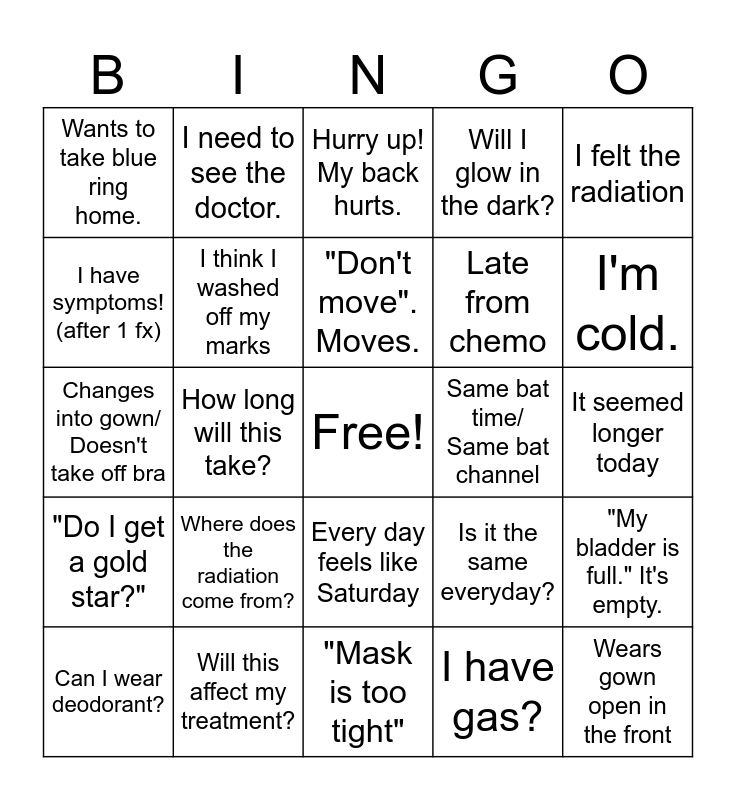 This bingo card has a free space and 24 words: Where does the radiation come from?, Will this affect my treatment?, "Don't move". Moves., Can I wear deodorant?, I felt the radiation, Wants to take blue ring home., I have symptoms! (after 1 fx), I need to see the doctor., Same bat time/ Same bat channel, Every day feels like Saturday, Late from chemo, Changes into gown/ Doesn't take off bra, Is it the same everyday?, "My bladder is full." It's empty., I think I washed off my marks, I have gas?, It seemed longer today, Hurry up! My back hurts., I'm cold., How long will this take?, Wears gown open in the front, "Do I get a gold star?", Will I glow in the dark? and "Mask is too tight".