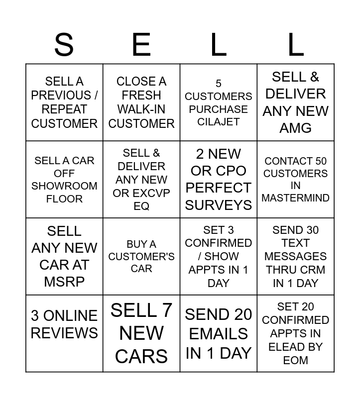 This bingo card has 16 words: 3 ONLINE REVIEWS, SELL 7 NEW CARS, 5 CUSTOMERS PURCHASE CILAJET, SELL & DELIVER ANY NEW AMG, SELL A CAR OFF SHOWROOM FLOOR, CLOSE A FRESH WALK-IN CUSTOMER, SET 3 CONFIRMED / SHOW APPTS IN 1 DAY, SEND 30 TEXT MESSAGES THRU CRM IN 1 DAY, SELL A PREVIOUS / REPEAT CUSTOMER, SELL & DELIVER ANY NEW OR EXCVP EQ, SEND 20 EMAILS IN 1 DAY, CONTACT 50 CUSTOMERS IN MASTERMIND, SELL ANY NEW CAR AT MSRP, BUY A CUSTOMER'S CAR, 2 NEW OR CPO PERFECT SURVEYS and SET 20 CONFIRMED APPTS IN ELEAD BY EOM.