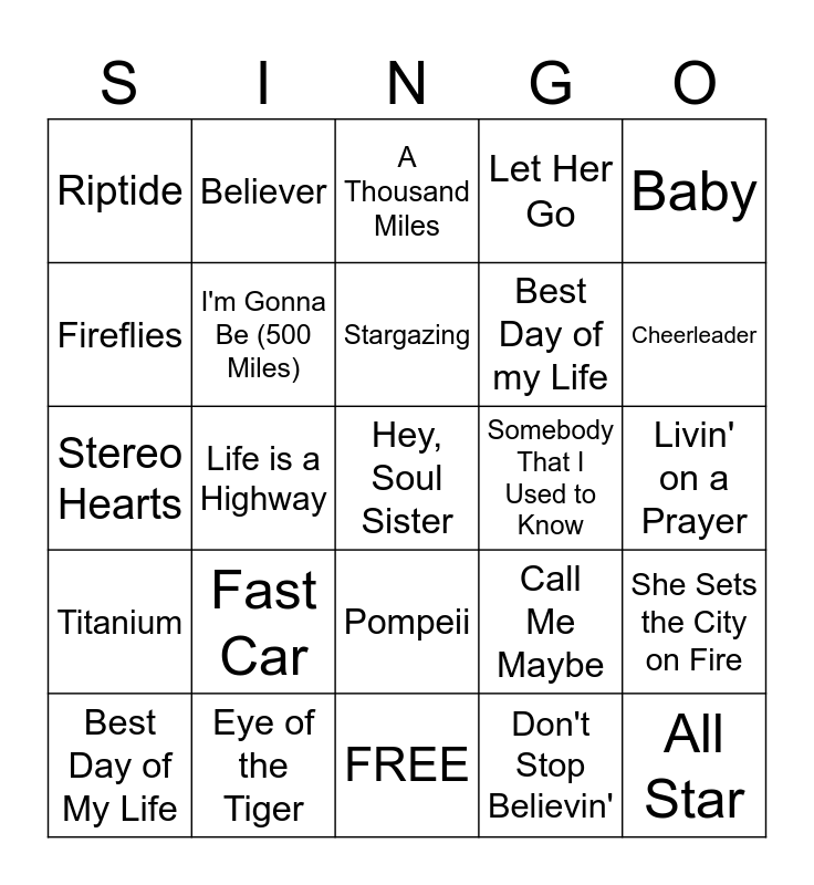 This bingo card has 29 words: Best Day of My Life, Rich Girl, Life is a Highway, All Star, Riptide, A Thousand Miles, I'm Gonna Be (500 Miles), Fast Car, Somebody That I Used to Know, Eye of the Tiger, Livin' on a Prayer, Hey, Soul Sister, FREE, Don't Stop Believin', Cheerleader, Good Time, Pompeii, Titanium, Baby, Stereo Hearts, Call Me Maybe, Girl on Fire, Best Day of my Life, Fireflies, Let Her Go, Believer, She Sets the City on Fire, Stargazing and Ho Hey.