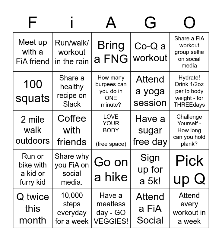 This bingo card has a free space and 24 words: Q twice this month, Share why you FiA on social media., How many burpees can you do in ONE minute?, Attend a FiA Social, Share a FiA workout group selfie on social media, Meet up with a FiA friend, Run/walk/ workout in the rain, Bring a FNG, Have a sugar free day, Challenge Yourself - How long can you hold plank?, 2 mile walk outdoors, Share a healthy recipe on Slack, Sign up for a 5k!, Pick up Q, 100 squats, 10,000 steps everyday for a week, Have a meatless day - GO VEGGIES!, Co-Q a workout, Hydrate! Drink 1/2oz per lb body weight - for THREEdays, Run or bike with a kid or furry kid, Coffee with friends, Go on a hike, Attend a yoga session and Attend every workout in a week.