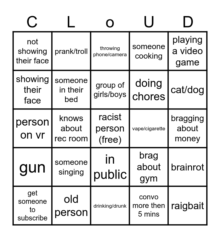 This bingo card has a free space and 24 words: someone singing, old person, group of girls/boys, get someone to subscribe, playing a video game, not showing their face, showing their face, prank/troll, vape/cigarette, in public, doing chores, person on vr, brag about gym, brainrot, someone in their bed, convo more then 5 mins, bragging about money, throwing phone/camera, cat/dog, knows about rec room, raigbait, gun, someone cooking and drinking/drunk.