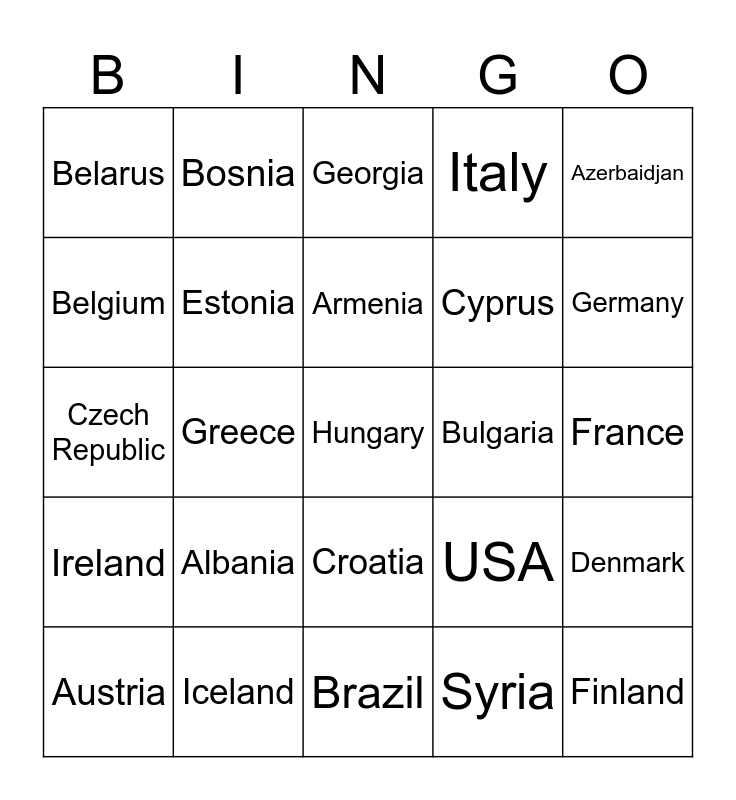 This bingo card has 25 words: Albania, Brazil, Armenia, Austria, Azerbaidjan, Belarus, Belgium, Bosnia, Bulgaria, Croatia, Cyprus, Czech Republic, USA, Denmark, Estonia, Finland, France, Georgia, Germany, Greece, Hungary, Iceland, Ireland, Italy and Syria.