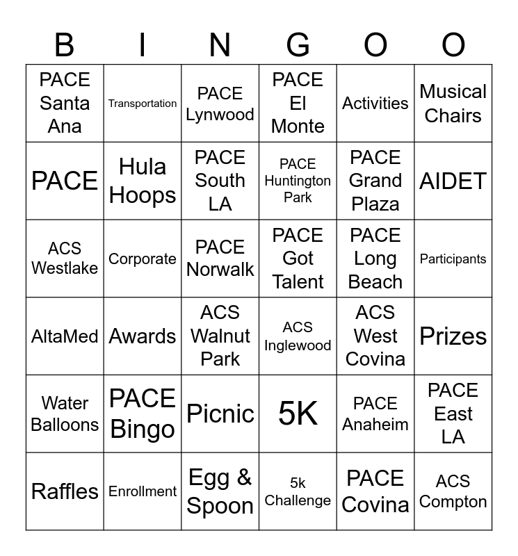 This bingo card has 36 words: 5K, Picnic, 5k Challenge, PACE, AltaMed, PACE Got Talent, Hula Hoops, Egg & Spoon, Activities, PACE Anaheim, AIDET, PACE El Monte, PACE East LA, Corporate, PACE Huntington Park, PACE Santa Ana, Water Balloons, PACE Long Beach, ACS Westlake, PACE Lynwood, PACE Norwalk, Awards, ACS Inglewood, ACS Walnut Park, ACS West Covina, Transportation, PACE Grand Plaza, Enrollment, PACE South LA, Musical Chairs, ACS Compton, Raffles, Prizes, Participants, PACE Bingo and PACE Covina.