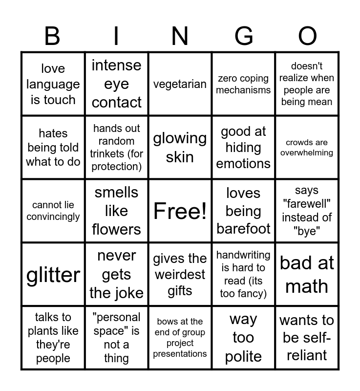 This bingo card has a free space and 24 words: talks to plants like they're people, never gets the joke, glowing skin, way too polite, doesn't realize when people are being mean, love language is touch, intense eye contact, vegetarian, loves being barefoot, says "farewell" instead of "bye", cannot lie convincingly, hands out random trinkets (for protection), handwriting is hard to read (its too fancy), bad at math, hates being told what to do, "personal space" is not a thing, bows at the end of group project presentations, zero coping mechanisms, crowds are overwhelming, glitter, smells like flowers, gives the weirdest gifts, good at hiding emotions and wants to be self-reliant.
