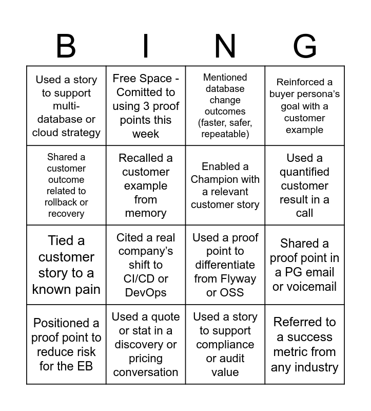 This bingo card has 16 words: Used a quote or stat in a discovery or pricing conversation, Shared a proof point in a PG email or voicemail, Mentioned database change outcomes (faster, safer, repeatable), Used a story to support multi-database or cloud strategy, Tied a customer story to a known pain, Free Space - Comitted to using 3 proof points this week, Used a proof point to differentiate from Flyway or OSS, Used a story to support compliance or audit value, Shared a customer outcome related to rollback or recovery, Recalled a customer example from memory, Positioned a proof point to reduce risk for the EB, Reinforced a buyer persona’s goal with a customer example, Cited a real company’s shift to CI/CD or DevOps, Used a quantified customer result in a call, Enabled a Champion with a relevant customer story and Referred to a success metric from any industry.