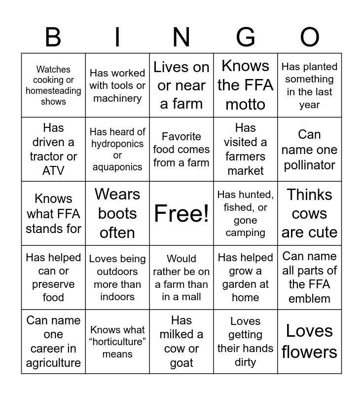 This bingo card has a free space and 27 words: Has helped grow a garden at home, Has fed chickens before, Has visited a farmers market, Has milked a cow or goat, Has driven a tractor or ATV, Lives on or near a farm, Has worked with tools or machinery, Has helped can or preserve food, Has hunted, fished, or gone camping, Can name all parts of the FFA emblem, Knows what FFA stands for, Knows the FFA motto, Can name one career in agriculture, Knows what “horticulture” means, Can name one pollinator, Can name a plant grown for fiber, Has heard of hydroponics or aquaponics, Favorite food comes from a farm, Loves being outdoors more than indoors, Watches cooking or homesteading shows, Thinks cows are cute, Loves getting their hands dirty, Wears boots often, Loves flowers, Would rather be on a farm than in a mall, Has planted something in the last year and Wants to learn how to grow their own food.