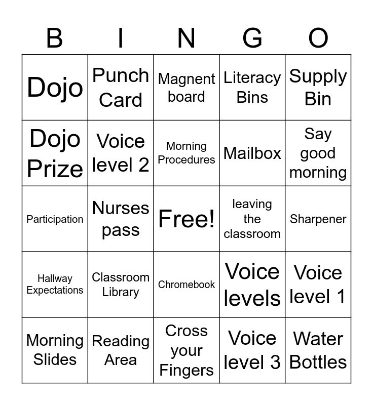 This bingo card has a free space and 24 words: Classroom Library, Reading Area, Morning Procedures, Morning Slides, Supply Bin, Dojo, Dojo Prize, Punch Card, leaving the classroom, Chromebook, Mailbox, Participation, Voice levels, Voice level 1, Voice level 2, Voice level 3, Sharpener, Magnent board, Say good morning, Nurses pass, Water Bottles, Hallway Expectations, Literacy Bins and Cross your Fingers.