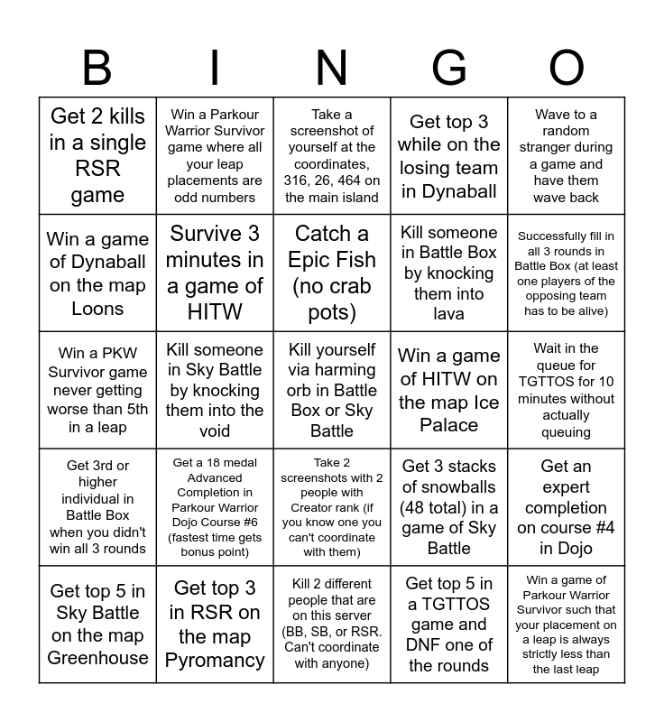 This bingo card has 25 words: Get a 18 medal Advanced Completion in Parkour Warrior Dojo Course #6 (fastest time gets bonus point), Kill 2 different people that are on this server (BB, SB, or RSR. Can't coordinate with anyone), Catch a Epic Fish (no crab pots), Get top 5 in Sky Battle on the map Greenhouse, Wave to a random stranger during a game and have them wave back, Get 2 kills in a single RSR game, Win a game of Dynaball on the map Loons, Win a Parkour Warrior Survivor game where all your leap placements are odd numbers, Win a game of HITW on the map Ice Palace, Take 2 screenshots with 2 people with Creator rank (if you know one you can't coordinate with them), Kill someone in Battle Box by knocking them into lava, Win a PKW Survivor game never getting worse than 5th in a leap, Get 3 stacks of snowballs (48 total) in a game of Sky Battle, Get an expert completion on course #4 in Dojo, Survive 3 minutes in a game of HITW, Win a game of Parkour Warrior Survivor such that your placement on a leap is always strictly less than the last leap, Wait in the queue for TGTTOS for 10 minutes without actually queuing, Take a screenshot of yourself at the coordinates, 316, 26, 464 on the main island, Successfully fill in all 3 rounds in Battle Box (at least one players of the opposing team has to be alive), Kill someone in Sky Battle by knocking them into the void, Kill yourself via harming orb in Battle Box or Sky Battle, Get top 3 in RSR on the map Pyromancy, Get 3rd or higher individual in Battle Box when you didn't win all 3 rounds, Get top 3 while on the losing team in Dynaball and Get top 5 in a TGTTOS game and DNF one of the rounds.
