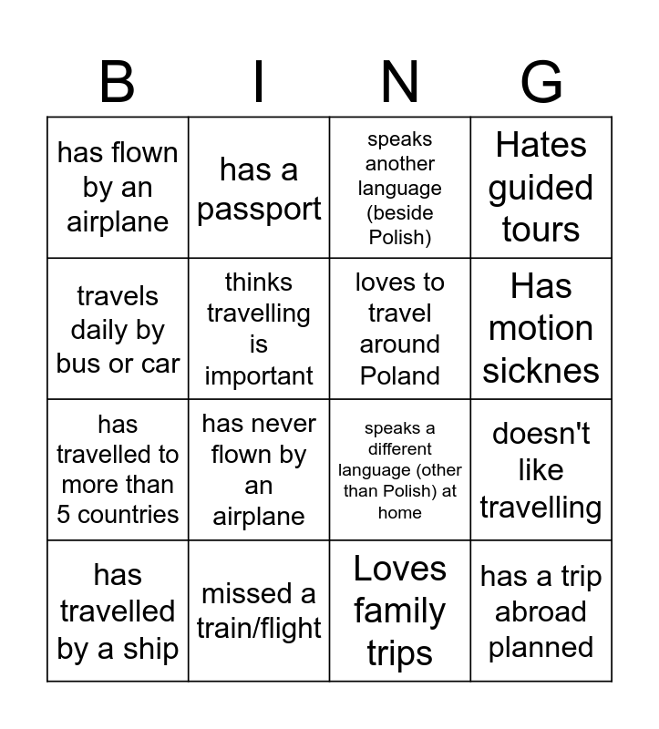 This bingo card has 20 words: doesn't like travelling, uses English outside of school, speaks another language (beside Polish), has been to a continent other than Europe, has travelled by a ship, travels daily by bus or car, missed a train/flight, has flown by an airplane, has travelled to more than 5 countries, has a passport, has never flown by an airplane, speaks a different language (other than Polish) at home, thinks travelling is important, has a trip abroad planned, loves to travel around Poland, is learning another foreign language, Has motion sicknes, Hates guided tours, Loves family trips and Visited Warsaw.