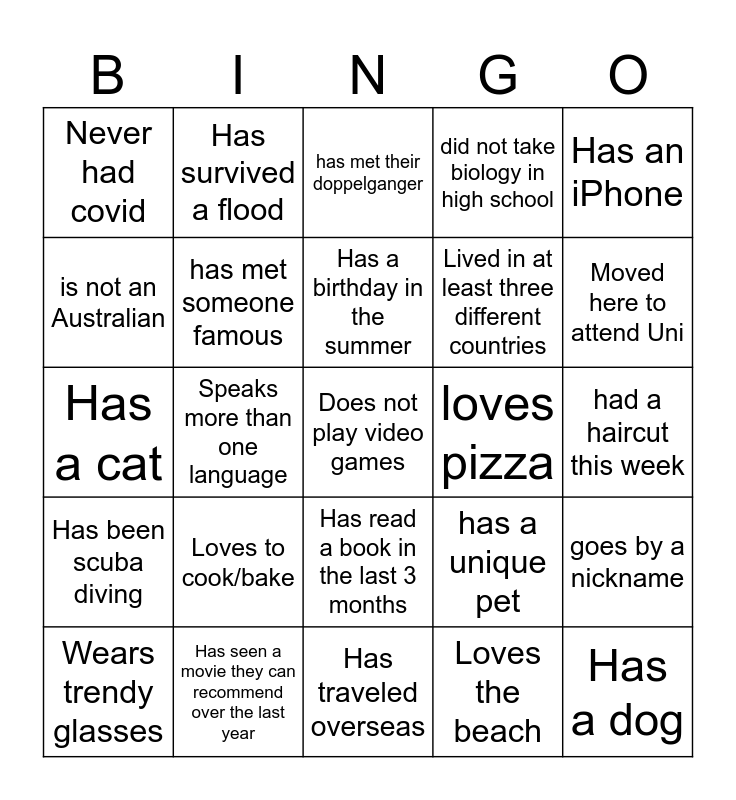 This bingo card has 25 words: Loves to cook/bake, Has traveled overseas, Has a birthday in the summer, Wears trendy glasses, Has an iPhone, Never had covid, is not an Australian, Has survived a flood, loves pizza, Has read a book in the last 3 months, Lived in at least three different countries, Has a cat, has a unique pet, goes by a nickname, has met someone famous, Has a dog, had a haircut this week, has met their doppelganger, Moved here to attend Uni, Speaks more than one language, Does not play video games, Has seen a movie they can recommend over the last year, Has been scuba diving, did not take biology in high school and Loves the beach.