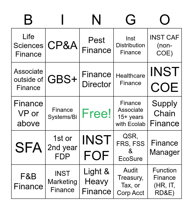 This bingo card has a free space and 24 words: 1st or 2nd year FDP, INST Marketing Finance, Finance Director, F&B Finance, INST CAF (non-COE), Life Sciences Finance, Associate outside of Finance, CP&A, Finance Associate 15+ years with Ecolab, INST FOF, Healthcare Finance, Finance VP or above, QSR, FRS, FSS & EcoSure, Finance Manager, GBS+, Audit Treasury, Tax, or Corp Acct, Supply Chain Finance, Pest Finance, INST COE, Finance Systems/Bi, Function Finance (HR, IT, RD&E), SFA, Inst Distribution Finance and Light & Heavy Finance.