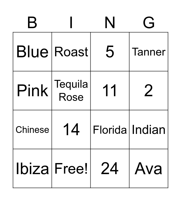 This bingo card has 28 words: 3, Blue, Chinese, Maldives, Tequila Rose, 5, Roast, Ava, Free!, Dipsy&Po, Florida, Tanner, Mae, June, 14, Chocolate, 10, 11, 2, Black, Blue, Vodka, Ibiza, Indian, 24, Lilly, Pink and Purple.