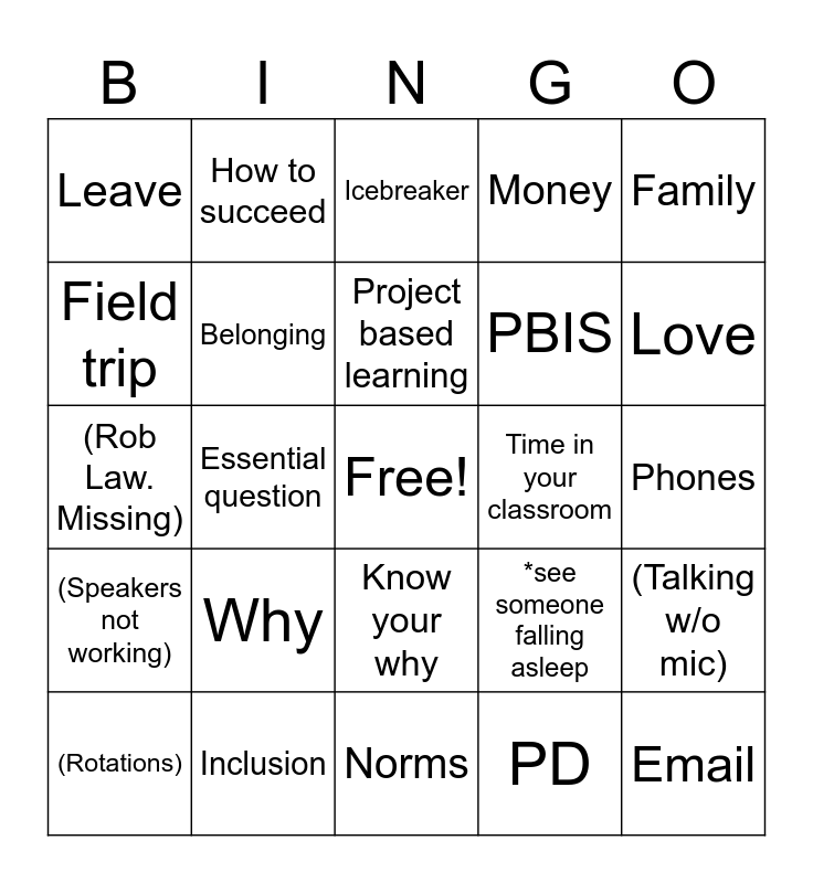 This bingo card has a free space and 24 words: Why, Inclusion, Project based learning, (Rotations), Family, Leave, Field trip, How to succeed, Time in your classroom, Know your why, PBIS, (Rob Law. Missing), *see someone falling asleep, (Talking w/o mic), Belonging, PD, Phones, Icebreaker, Love, Essential question, Email, (Speakers not working), Money and Norms.