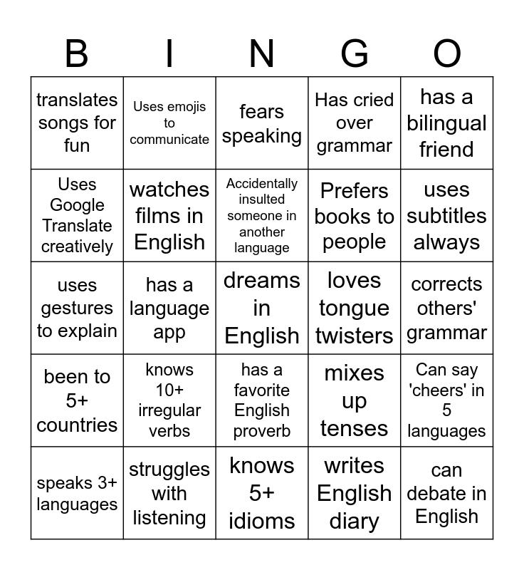 This bingo card has a free space and 29 words: speaks 3+ languages, hates grammar drills, has a language app, uses slang correctly, translates songs for fun, fears speaking, watches films in English, knows 10+ irregular verbs, loves tongue twisters, struggles with listening, corrects others' grammar, can debate in English, knows 5+ idioms, writes English diary, uses subtitles always, learned a language abroad, has a favorite English proverb, been to 5+ countries, has a bilingual friend, uses gestures to explain, mixes up tenses, memorized a speech, Prefers books to people, Uses Google Translate creatively, Has cried over grammar, Uses emojis to communicate, Can say 'cheers' in 5 languages, Accidentally insulted someone in another language and Knows a joke in 2+ languages.