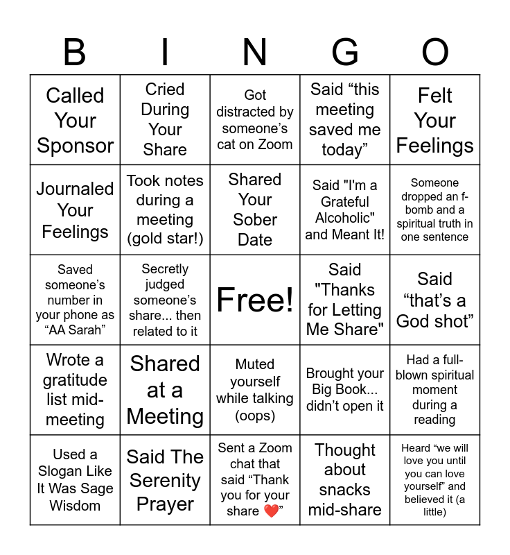 This bingo card has a free space and 24 words: Shared at a Meeting, Said The Serenity Prayer, Shared Your Sober Date, Used a Slogan Like It Was Sage Wisdom, Felt Your Feelings, Called Your Sponsor, Journaled Your Feelings, Cried During Your Share, Said "Thanks for Letting Me Share", Muted yourself while talking (oops), Said "I'm a Grateful Alcoholic" and Meant It!, Saved someone’s number in your phone as “AA Sarah”, Brought your Big Book... didn’t open it, Had a full-blown spiritual moment during a reading, Took notes during a meeting (gold star!), Thought about snacks mid-share, Said “that’s a God shot”, Got distracted by someone’s cat on Zoom, Someone dropped an f-bomb and a spiritual truth in one sentence, Secretly judged someone’s share... then related to it, Heard “we will love you until you can love yourself” and believed it (a little), Wrote a gratitude list mid-meeting, Said “this meeting saved me today” and Sent a Zoom chat that said “Thank you for your share ❤️”.
