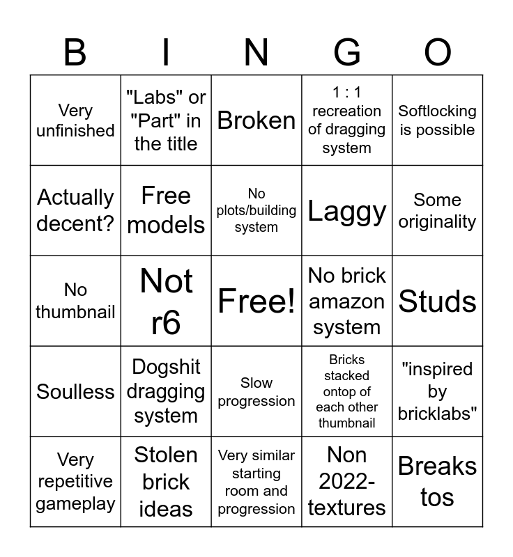 This bingo card has a free space and 24 words: Dogshit dragging system, Stolen brick ideas, No plots/building system, Very repetitive gameplay, Softlocking is possible, Very unfinished, Actually decent?, "Labs" or "Part" in the title, No brick amazon system, Slow progression, Laggy, No thumbnail, Bricks stacked ontop of each other thumbnail, "inspired by bricklabs", Free models, Non 2022- textures, Studs, Broken, Some originality, Not r6, Breaks tos, Soulless, 1 : 1 recreation of dragging system and Very similar starting room and progression.