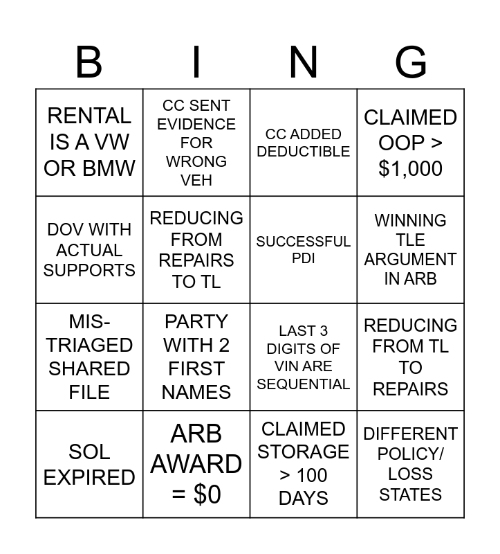 This bingo card has 18 words: PARTY WITH 2 FIRST NAMES, DIFFERENT POLICY/ LOSS STATES, CC ADDED DEDUCTIBLE, RENTAL IS A VW OR BMW, LAST 3 DIGITS OF VIN ARE SEQUENTIAL, CLAIMED OOP > $1,000, SOL EXPIRED, CC SENT EVIDENCE FOR WRONG VEH, WINNING TLE ARGUMENT IN ARB, MIS-TRIAGED SHARED FILE, CLAIMED STORAGE > 100 DAYS, DOV WITH ACTUAL SUPPORTS, REDUCING FROM TL TO REPAIRS, REDUCING FROM REPAIRS TO TL, SUCCESSFUL PDI, DISPUTING OEM PARTS WITH LKQ, ARB AWARD = $0 and SUPPORTED REFURB.