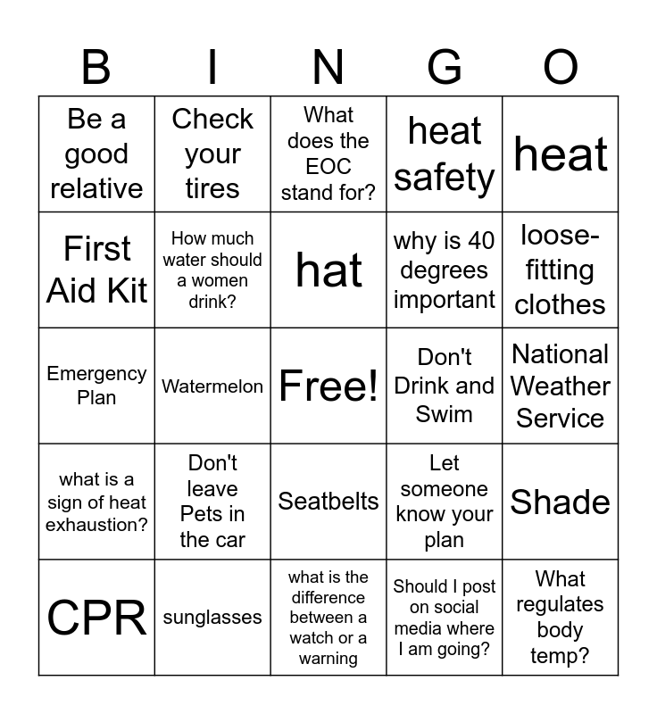 This bingo card has a free space and 24 words: Don't leave Pets in the car, sunglasses, hat, CPR, heat, Be a good relative, First Aid Kit, Check your tires, Don't Drink and Swim, Seatbelts, why is 40 degrees important, Emergency Plan, Let someone know your plan, Shade, How much water should a women drink?, Should I post on social media where I am going?, National Weather Service, What does the EOC stand for?, loose-fitting clothes, Watermelon, What regulates body temp?, what is a sign of heat exhaustion?, heat safety and what is the difference between a watch or a warning.