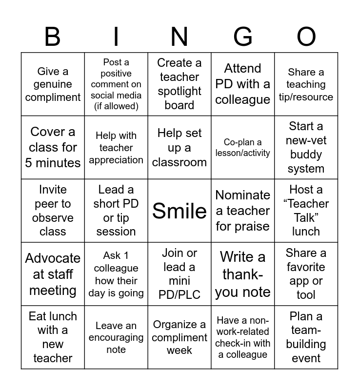 This bingo card has a free space and 24 words: Ask 1 colleague how their day is going, Leave an encouraging note, Help set up a classroom, Eat lunch with a new teacher, Share a teaching tip/resource, Give a genuine compliment, Cover a class for 5 minutes, Post a positive comment on social media (if allowed), Nominate a teacher for praise, Join or lead a mini PD/PLC, Co-plan a lesson/activity, Invite peer to observe class, Write a thank-you note, Share a favorite app or tool, Help with teacher appreciation, Have a non-work-related check-in with a colleague, Host a “Teacher Talk” lunch, Create a teacher spotlight board, Start a new-vet buddy system, Lead a short PD or tip session, Plan a team-building event, Advocate at staff meeting, Attend PD with a colleague and Organize a compliment week.
