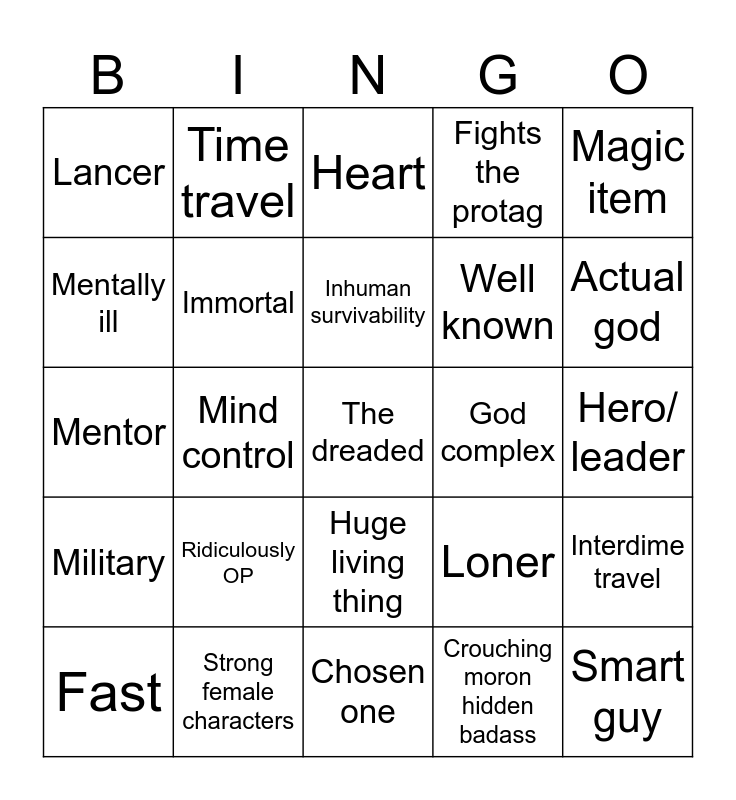 This bingo card has a free space and 29 words: Fast, Dies, Mind control, Big guy, Lancer, Heart, Immortal, Ridiculously OP, God complex, Strong female characters, Hero/ leader, Smart guy, Chosen one, Crouching moron hidden badass, Actual god, Prodigy, Huge living thing, Military, Magic item, Mentor, Loner, Privileged, Well known, Mentally ill, Fights the protag, Time travel, Interdime travel, Inhuman survivability and Energy beam.