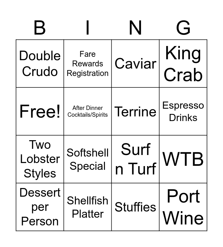 This bingo card has 16 words: Shellfish Platter, WTB, Caviar, Double Crudo, Two Lobster Styles, Fare Rewards Registration, Surf n Turf, Stuffies, Free!, After Dinner Cocktails/Spirits, Dessert per Person, King Crab, Softshell Special, Espresso Drinks, Terrine and Port Wine.