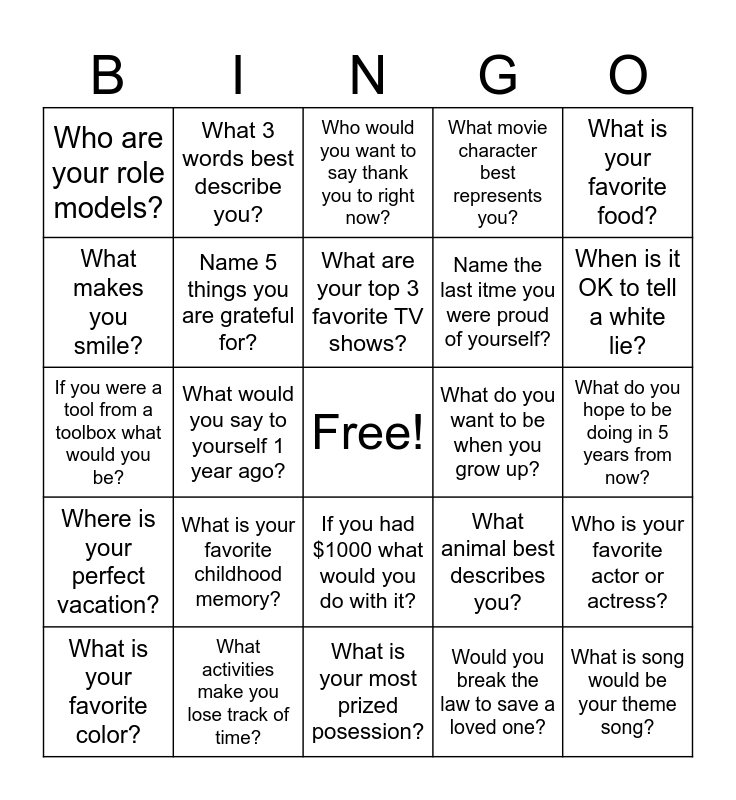 This bingo card has a free space and 24 words: What is your favorite childhood memory?, What activities make you lose track of time?, What are your top 3 favorite TV shows?, What is your favorite color?, What is your favorite food?, Who are your role models?, What makes you smile?, What 3 words best describe you?, What do you want to be when you grow up?, If you had $1000 what would you do with it?, Name the last itme you were proud of yourself?, If you were a tool from a toolbox what would you be?, What animal best describes you?, Who is your favorite actor or actress?, Name 5 things you are grateful for?, Would you break the law to save a loved one?, What do you hope to be doing in 5 years from now?, Who would you want to say thank you to right now?, When is it OK to tell a white lie?, What would you say to yourself 1 year ago?, What is song would be your theme song?, Where is your perfect vacation?, What movie character best represents you? and What is your most prized posession?.