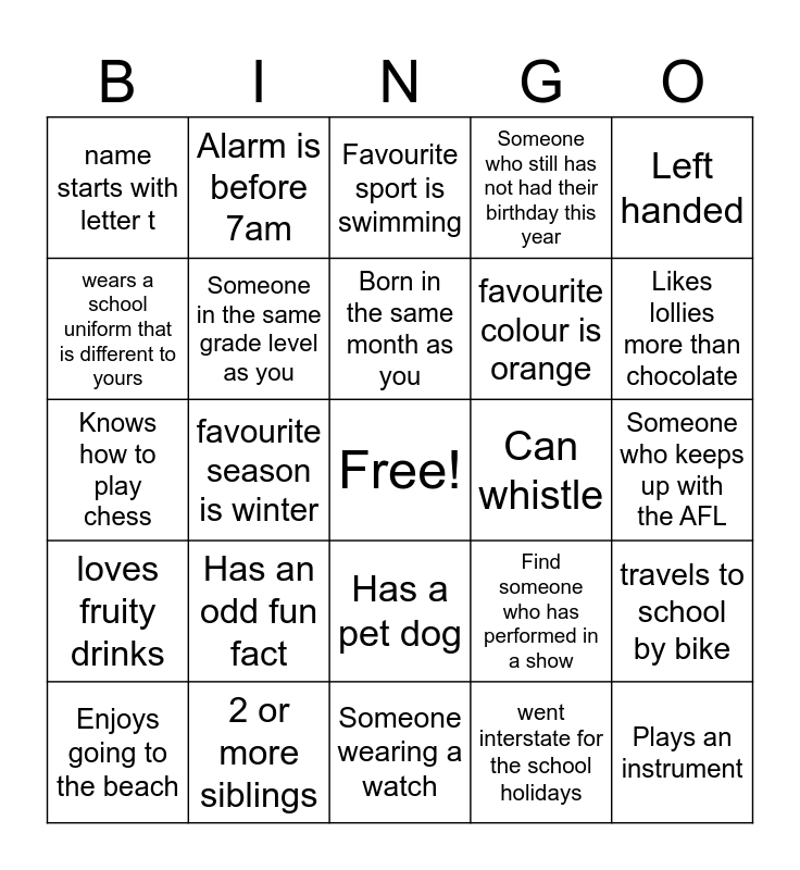 This bingo card has a free space and 24 words: Has an odd fun fact, 2 or more siblings, Born in the same month as you, Enjoys going to the beach, Left handed, name starts with letter t, wears a school uniform that is different to yours, Alarm is before 7am, Can whistle, Has a pet dog, favourite colour is orange, Knows how to play chess, Find someone who has performed in a show, travels to school by bike, Someone in the same grade level as you, went interstate for the school holidays, Someone who keeps up with the AFL, Favourite sport is swimming, Likes lollies more than chocolate, favourite season is winter, Plays an instrument, loves fruity drinks, Someone who still has not had their birthday this year and Someone wearing a watch.