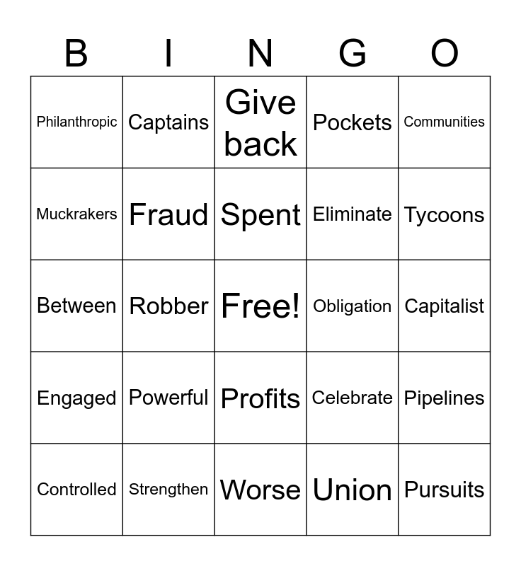 This bingo card has a free space and 60 words: Means, Strengthen, Monopolies, Engaged, Union, Busting, Fraud, Corruption, Eliminate, Competitors, Pockets, Exposed, Muckrakers, Meanwhile, Wealth, Philanthropic, Pursuits, Communities, Andrew Carnegie, Spent, Obligation, Give back, Controlled, Pipelines, Refineries, Donated, Charities, Contrasts, Tycoons, Future, Workers, Wages, Workplace, Industrious, Captains, Unprecedented, Growth, Robber, Barons, Between, Civil war, Powerful, Capitalist, nation, Celebrate, Advances, Technology, Vast, Unregulated, Profits, Worse, Often, Forced, Long, Pay, Lifetime, Good causes, Entire, Pledge and recognize.