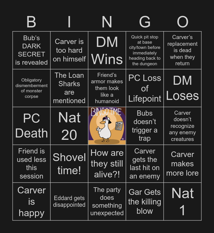 This bingo card has a free space and 24 words: Shovel time!, Eddard gets disappointed, Friend’s armor makes them look like a humanoid, Carver is happy, Carver’s replacement is dead when they return, Bub’s DARK SECRET is revealed, Obligatory dismemberment of monster corpse, Carver is too hard on himself, Bubs doesn’t trigger a trap, How are they still alive?!, PC Loss of Lifepoint, PC Death, Carver gets the last hit on an enemy, Carver makes more lore, The Loan Sharks are mentioned, Gar Gets the killing blow, Carver doesn’t recognize any enemy creatures, DM Wins, DM Loses, Nat 20, Nat 1, Friend is used less this session, Quick pit stop at base city/town before immediately heading back to the dungeon and The party does something unexpected.
