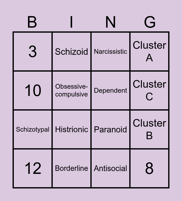 This bingo card has 16 words: 12, Borderline, Narcissistic, Cluster A, 10, Schizoid, Paranoid, Cluster B, 3, Obsessive-compulsive, Antisocial, Cluster C, Schizotypal, Histrionic, Dependent and 8.
