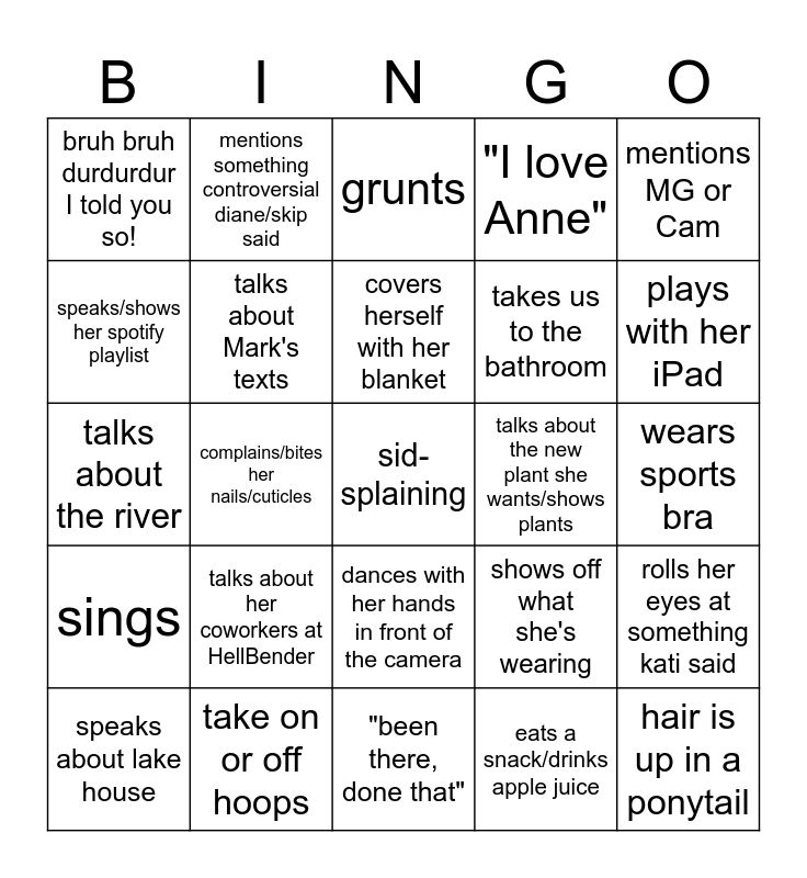 This bingo card has a free space and 24 words: talks about her coworkers at HellBender, take on or off hoops, covers herself with her blanket, speaks about lake house, mentions MG or Cam, bruh bruh durdurdur I told you so!, speaks/shows her spotify playlist, mentions something controversial diane/skip said, talks about the new plant she wants/shows plants, dances with her hands in front of the camera, takes us to the bathroom, talks about the river, shows off what she's wearing, rolls her eyes at something kati said, talks about Mark's texts, eats a snack/drinks apple juice, wears sports bra, grunts, plays with her iPad, complains/bites her nails/cuticles, hair is up in a ponytail, sings, "I love Anne" and "been there, done that".