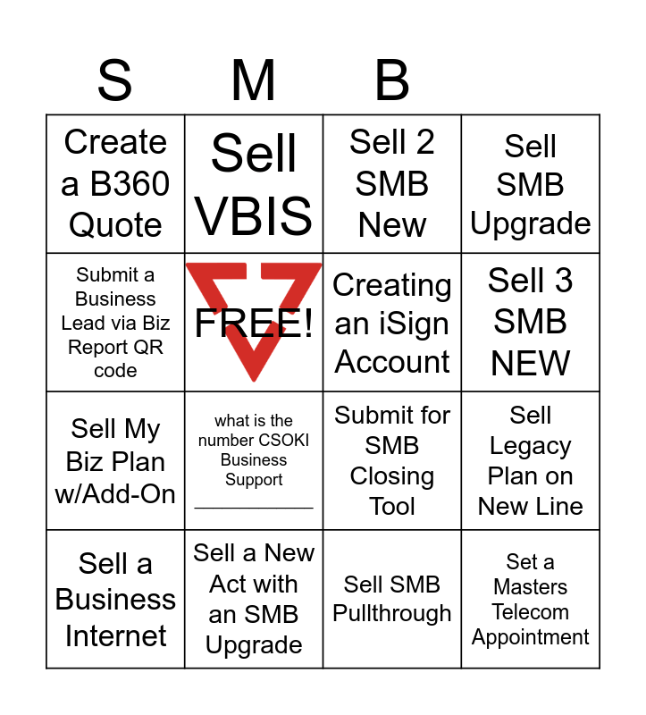 This bingo card has 1 images and 16 words: Sell a Business Internet, Sell a New Act with an SMB Upgrade, Sell 2 SMB New, Sell SMB Upgrade, Submit a Business Lead via Biz Report QR code, Sell VBIS, Submit for SMB Closing Tool, Sell Legacy Plan on New Line, Create a B360 Quote, FREE!, Sell SMB Pullthrough, Sell 3 SMB NEW, Sell My Biz Plan w/Add-On, what is the number CSOKI Business Support _____________, Creating an iSign Account and Set a Masters Telecom Appointment.