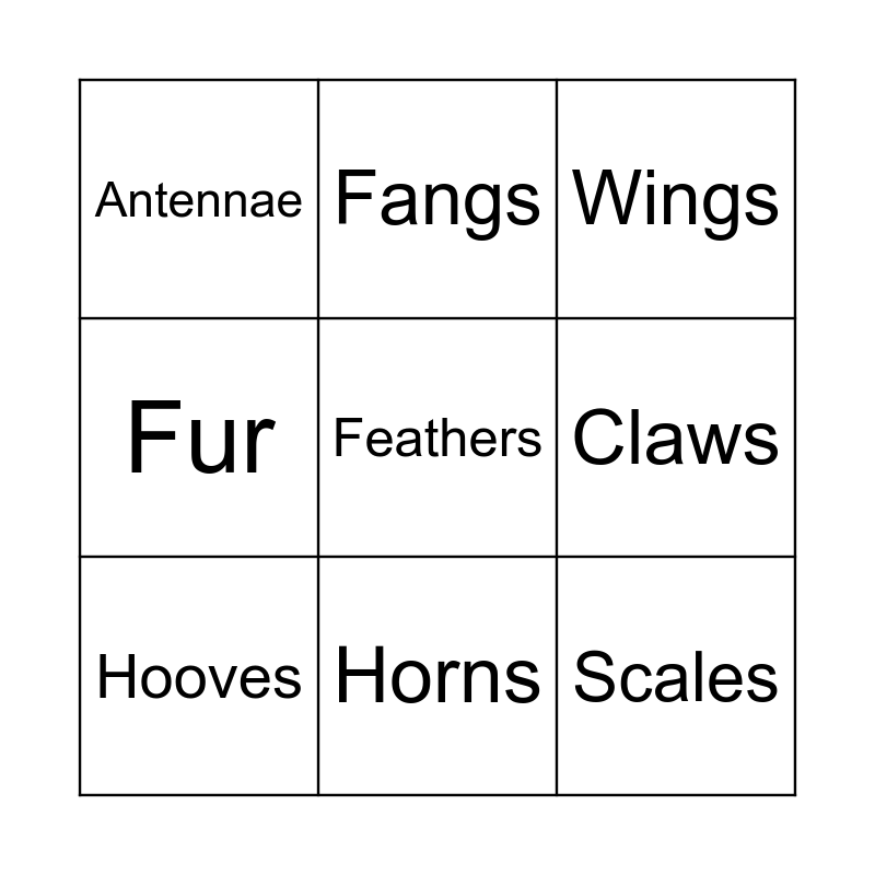 This bingo card has 10 words: Horns, Wings, Antennae, Feathers, Fur, Hooves, Fangs, Tails, Claws and Scales.