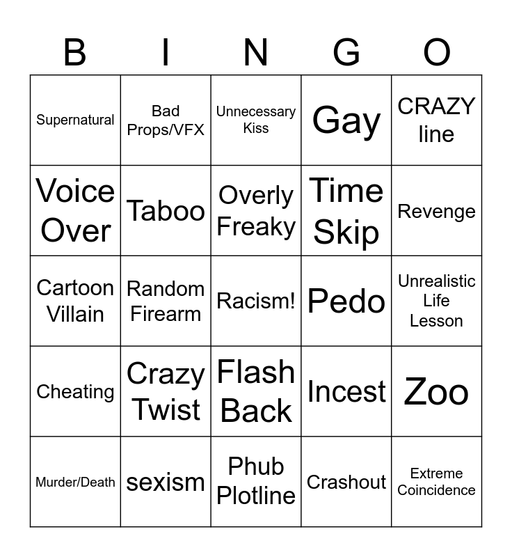 This bingo card has a free space and 24 words: Crazy Twist, sexism, Overly Freaky, Murder/Death, CRAZY line, Supernatural, Voice Over, Bad Props/VFX, Pedo, Flash Back, Time Skip, Cartoon Villain, Incest, Zoo, Taboo, Crashout, Unrealistic Life Lesson, Unnecessary Kiss, Revenge, Random Firearm, Extreme Coincidence, Cheating, Gay and Phub Plotline.