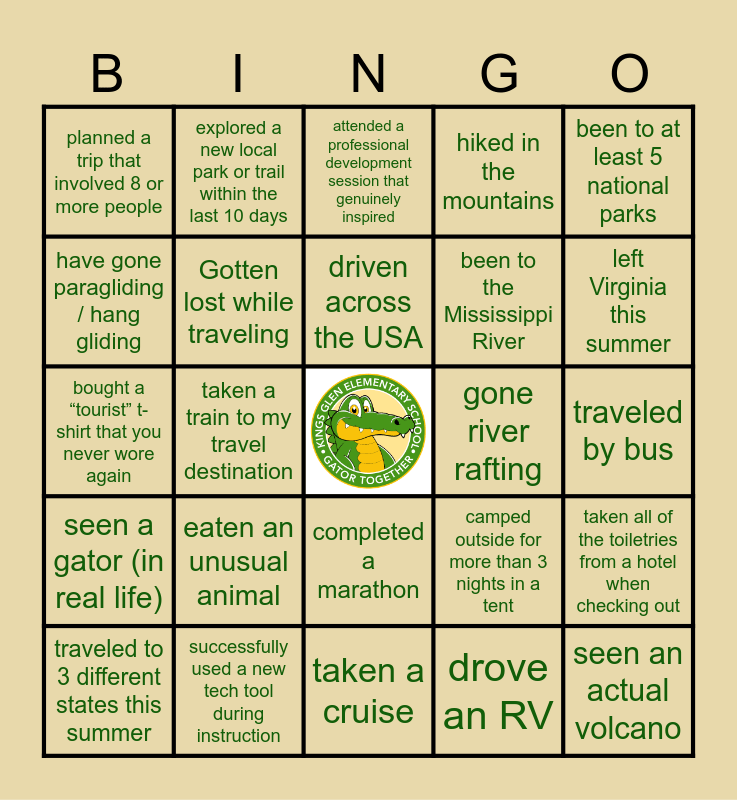 This bingo card has a free space and 39 words: traveled to 3 places that being with the letter G, swam with dolphins, traveled to at least 3 sporting stadiums, Gotten lost while traveling, traveled to 3 different states this summer, completed a marathon, driven across the USA, traveled to at least 3 continents, been to at least 5 national parks, seen a gator (in real life), taken a train to my travel destination, hiked in the mountains, seen an actual volcano, traveled by bus, gone river rafting, eaten an unusual animal, traveled by yourself, planned a trip that involved 8 or more people, taken a helicopter ride, camped outside for more than 3 nights in a tent, have gone paragliding / hang gliding, taken a cruise, been to the Mississippi River, left Virginia this summer, traveled with a pet, traveled with more than 4 kids, discovered a new favorite coffee/tea spot near school, Drank 8 glasses of water in a school day, tried cooking a new recipe, explored a new local park or trail within the last 10 days, have not used "snooze" for the last 10 days, laughed until your stomach hurt with a colleague, attended a professional development session that genuinely inspired, successfully used a new tech tool during instruction, drove an RV, used a map (not a GPS) during a road trip, taken all of the toiletries from a hotel when checking out, bought a “tourist” t-shirt that you never wore again and lost your bag on a trip/while traveling.