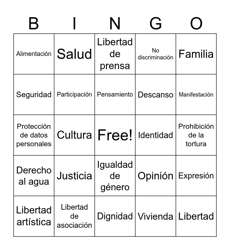This bingo card has a free space and 50 words: Vida, Libertad, Igualdad, Dignidad, Justicia, Educación, Salud, Trabajo, Seguridad, Propiedad, Participación, No discriminación, Expresión, Opinión, Reunión, Religión, Pensamiento, Identidad, Nacionalidad, Familia, Cultura, Vivienda, Alimentación, Descanso, Asilo, Voto, Manifestación, Protección, Libertad de prensa, Igualdad de género, Medio ambiente sano, Integridad, Desarrollo, Libertad de tránsito, Libertad de asociación, Seguridad social, Protección a la niñez, Protección a la vejez, Protección a personas con discapacidad, Prohibición de la tortura, Libertad académica, Protección contra detención arbitraria, Presunción de inocencia, Acceso a la información, Libertad artística, Protección de datos personales, Protección de refugiados, Protección de la diversidad cultural, Derecho al agua and Derecho a la paz.
