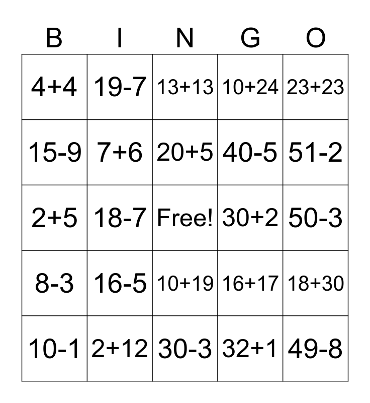 This bingo card has a free space and 24 words: 10-1, 16-5, 20+5, 32+1, 23+23, 4+4, 19-7, 13+13, 30+2, 50-3, 2+5, 7+6, 16+17, 18+30, 15-9, 2+12, 30-3, 10+24, 51-2, 8-3, 18-7, 10+19, 40-5 and 49-8.
