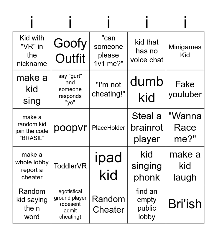 This bingo card has 25 words: ToddlerVR, Random Cheater, "I'm not cheating!", Random kid saying the n word, Minigames Kid, Kid with "VR" in the nickname, make a kid sing, Goofy Outfit, Steal a brainrot player, ipad kid, dumb kid, make a random kid join the code "BRASIL", kid singing phonk, make a kid laugh, say "gurt" and someone responds "yo", Bri'ish, "Wanna Race me?", "can someone please 1v1 me?", Fake youtuber, poopvr, PlaceHolder, egotistical ground player (doesent admit cheating), make a whole lobby report a cheater, kid that has no voice chat and find an empty public lobby.