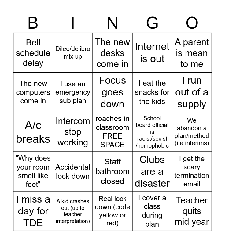 This bingo card has a free space and 24 words: Accidental lock down, A kid crashes out (up to teacher interpretation), Focus goes down, I miss a day for TDE, A parent is mean to me, Bell schedule delay, The new computers come in, Dileo/delibro mix up, School board official is racist/sexist /homophobic, Staff bathroom closed, I eat the snacks for the kids, A/c breaks, Clubs are a disaster, I get the scary termination email, I use an emergency sub plan, I cover a class during plan, We abandon a plan/method (i.e interims), The new desks come in, I run out of a supply, Intercom stop working, Teacher quits mid year, "Why does your room smell like feet", Internet is out and Real lock down (code yellow or red).