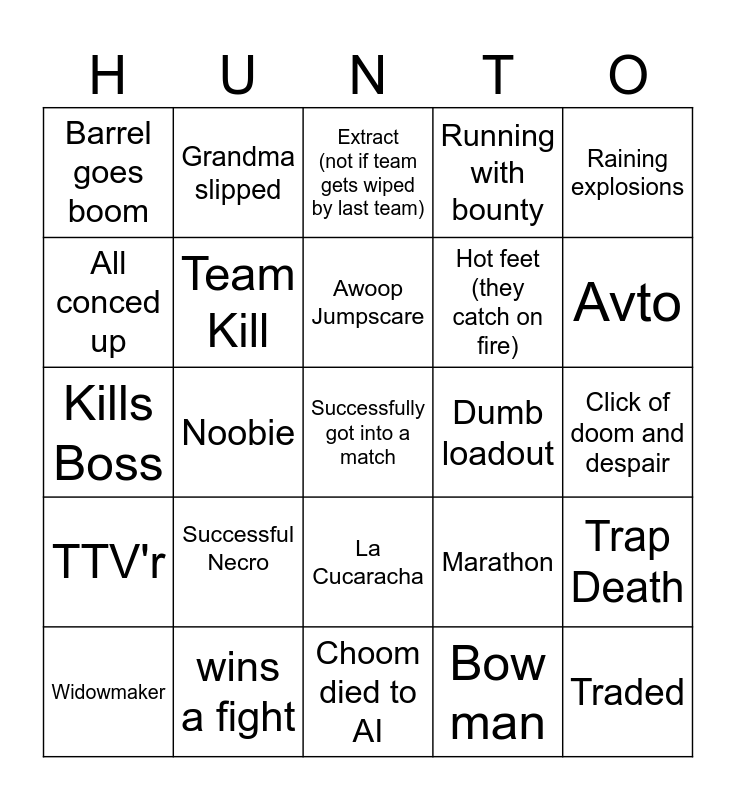 This bingo card has a free space and 24 words: Successful Necro, wins a fight, Awoop Jumpscare, Widowmaker, Raining explosions, Barrel goes boom, All conced up, Grandma slipped, Dumb loadout, La Cucaracha, Hot feet (they catch on fire), Kills Boss, Marathon, Trap Death, Team Kill, Bow man, Click of doom and despair, Extract (not if team gets wiped by last team), Avto, Noobie, Traded, TTV'r, Running with bounty and Choom died to AI.