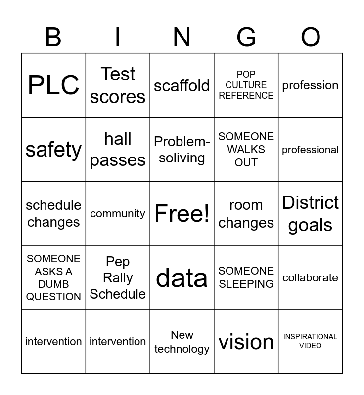 This bingo card has a free space and 26 words: data, vision, Problem-soliving, intervention, profession, PLC, safety, Test scores, District goals, SOMEONE SLEEPING, SOMEONE WALKS OUT, schedule changes, collaborate, intervention, community, multicultural, POP CULTURE REFERENCE, SOMEONE ASKS A DUMB QUESTION, scaffold, INSPIRATIONAL VIDEO, professional, New technology, room changes, Pep Rally Schedule, hall passes and cell phone.